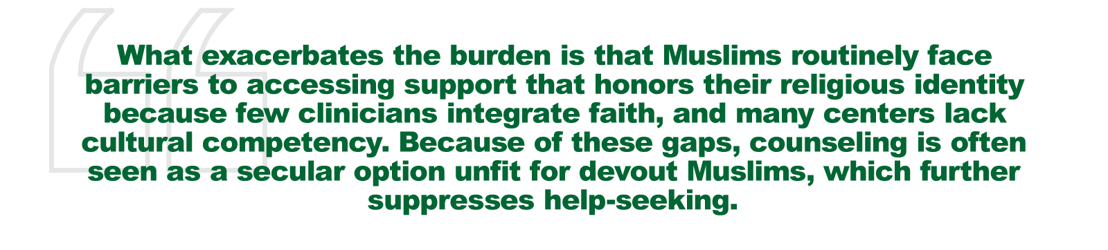 Mental suffering is not alien to Muslims. Yet too often, distress goes unspoken, hidden behind walls of shame or dismissed as “weakness in faith.” While precise prevalence data is hard to capture in many Muslim communities because of underreporting, clinical experience and community surveys alike show that anxiety, depression, trauma, and existential distress are widespread. What exacerbates the burden is that Muslims routinely face barriers to accessing support that honors their religious identity because few clinicians integrate faith, and many centers lack cultural competency. Because of these gaps, counseling is often seen as a secular option unfit for devout Muslims, which further suppresses help-seeking.