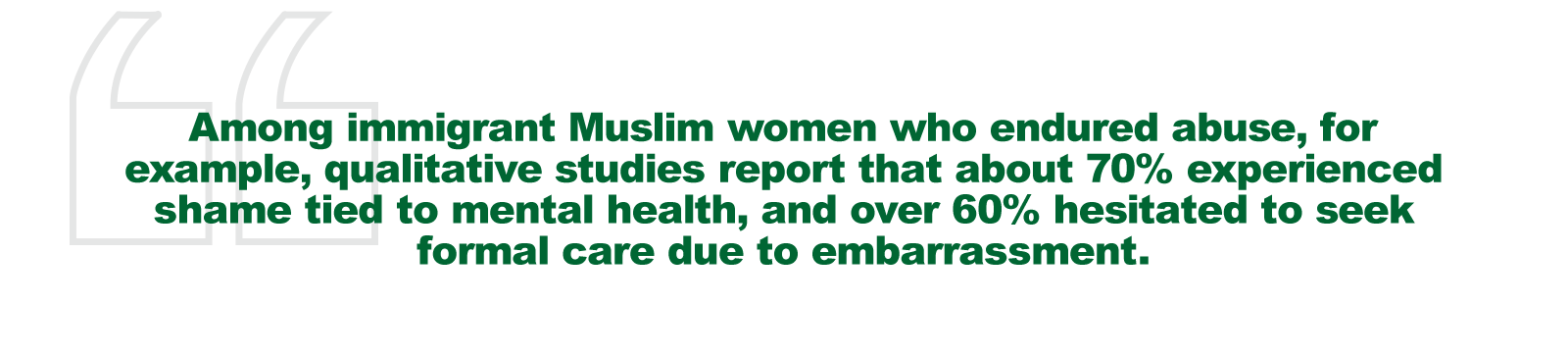 Even among devout individuals, internalized stigma can act like a barrier because of the sense that to admit you’re struggling is to admit spiritual failure. Among immigrant Muslim women who endured abuse, for example, qualitative studies report that about 70% experienced shame tied to mental health, and over 60% hesitated to seek formal care due to embarrassment.