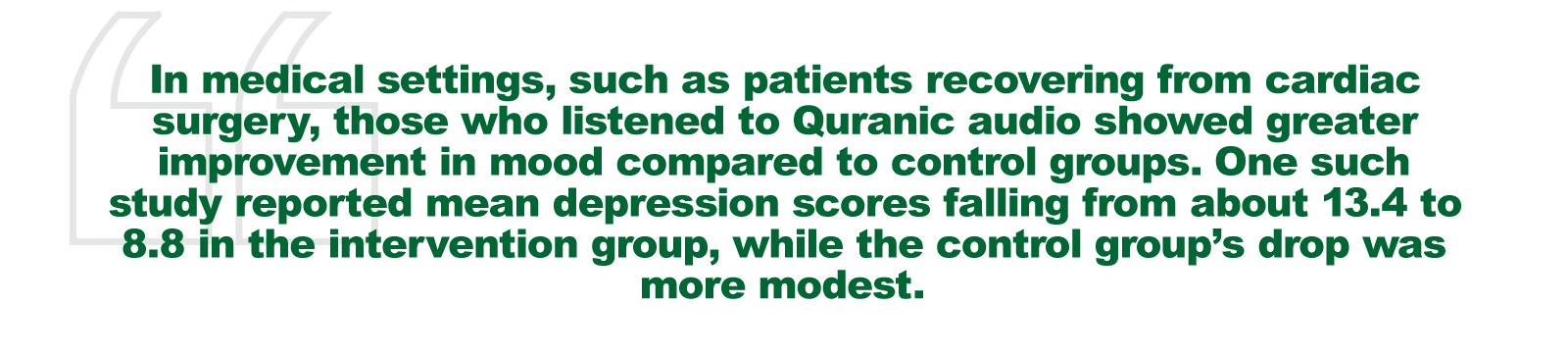 From their childhood, Muslims learn of the sweetness of Quranic recitation. But beyond its ritual perfection, the act of reciting or listening can also become a balm for the heart. In several trials and observational studies, engaging with Quranic recitation has been associated with reductions in anxiety, stress, and depressive symptoms. For example, a scoping review of 15 studies found consistent associations between listening to or reciting The Quran and lower levels of psychological distress. In medical settings, such as patients recovering from cardiac surgery, those who listened to Quranic audio showed greater improvement in mood compared to control groups. One such study reported mean depression scores falling from about 13.4 to 8.8 in the intervention group, while the control group’s drop was more modest.