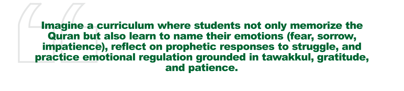 At its best, Islamic education should teach more than fiqh, tajweed, and tafseer. It should cultivate emotional intelligence, resilience and self-understanding under the umbrella of Islamic ethics. Imagine a curriculum where students not only memorize the Quran but also learn to name their emotions (fear, sorrow, impatience), reflect on prophetic responses to struggle, and practice emotional regulation grounded in tawakkul, gratitude, and patience.