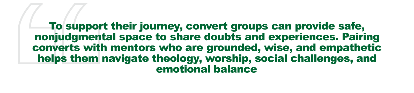 Conversion is a journey, often accompanied by emotional turbulence, isolation, identity shifts, and fear of judgment. Many converts carry the weight of perfectionism. “I must be the best Muslim immediately,” which can lead to burnout or guilt. Others feel disconnected from support systems. To support their journey, convert groups can provide safe, nonjudgmental space to share doubts and experiences. Pairing converts with mentors who are grounded, wise, and empathetic helps them navigate theology, worship, social challenges, and emotional balance.