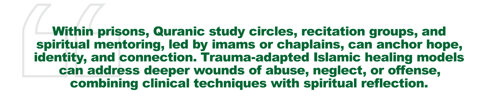 In prisons, many Muslims face profound isolation, shame, trauma, and rupture from their communities. Yet these spaces also offer opportunity for structured time, religious motivation, and a potential for transformation. Within prisons, Quranic study circles, recitation groups, and spiritual mentoring, led by imams or chaplains, can anchor hope, identity, and connection. Trauma-adapted Islamic healing models can address deeper wounds of abuse, neglect, or offense, combining clinical techniques with spiritual reflection.