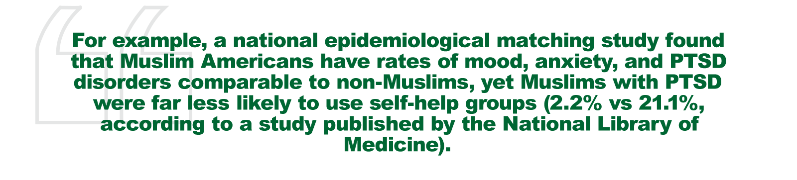 Therapeutic models that integrate Islamic values and psychological techniques are promising in principle, but in the U.S. context, there are currently almost no rigorous trials of such models among Muslim Americans. Instead, the extant U.S. data are descriptive and qualitative, focusing on barriers, perceptions, and help-seeking attitudes. For example, a national epidemiological matching study found that Muslim Americans have rates of mood, anxiety, and PTSD disorders comparable to non-Muslims, yet Muslims with PTSD were far less likely to use self-help groups (2.2% vs 21.1%, according to a study published by the National Library of Medicine).