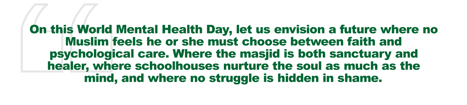 On this World Mental Health Day, let us envision a future where no Muslim feels he or she must choose between faith and psychological care. Where the masjid is both sanctuary and healer, where schoolhouses nurture the soul as much as the mind, and where no struggle is hidden in shame.