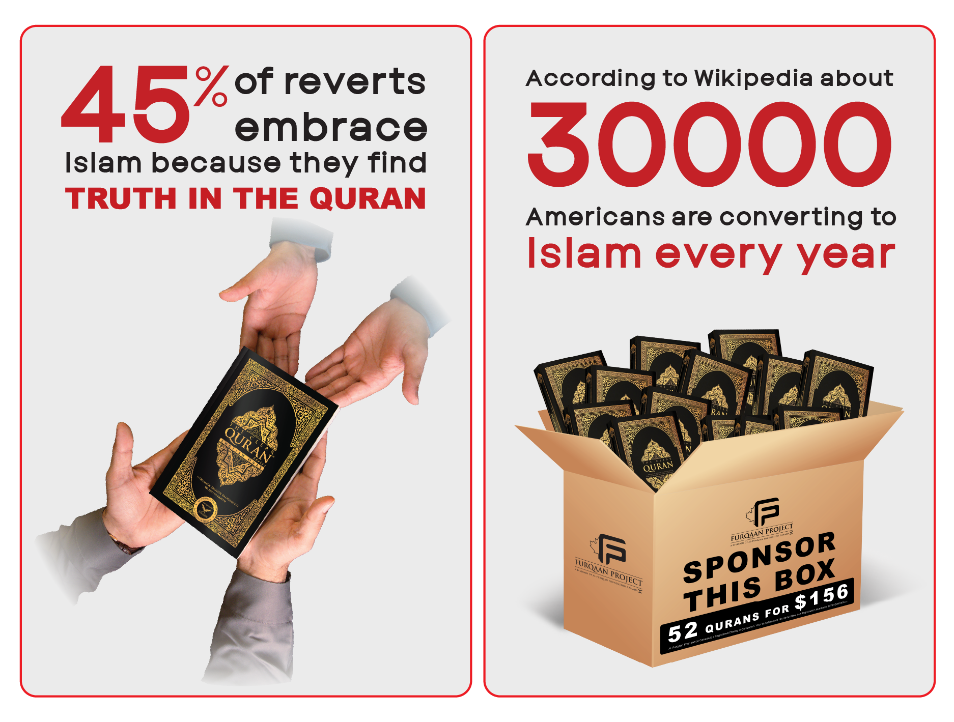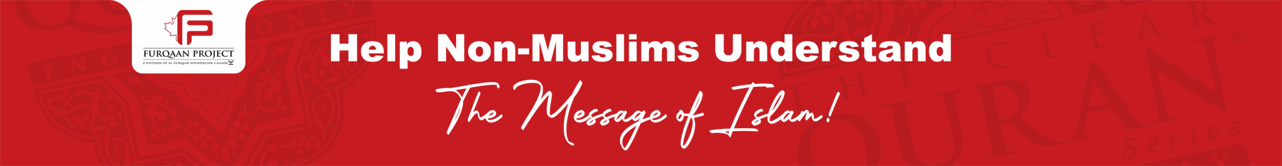 The mission of Furqaan Project Canada is to deliver a free copy of the English translation of the message of the Quran to every non-Muslim man, woman, and child in America.